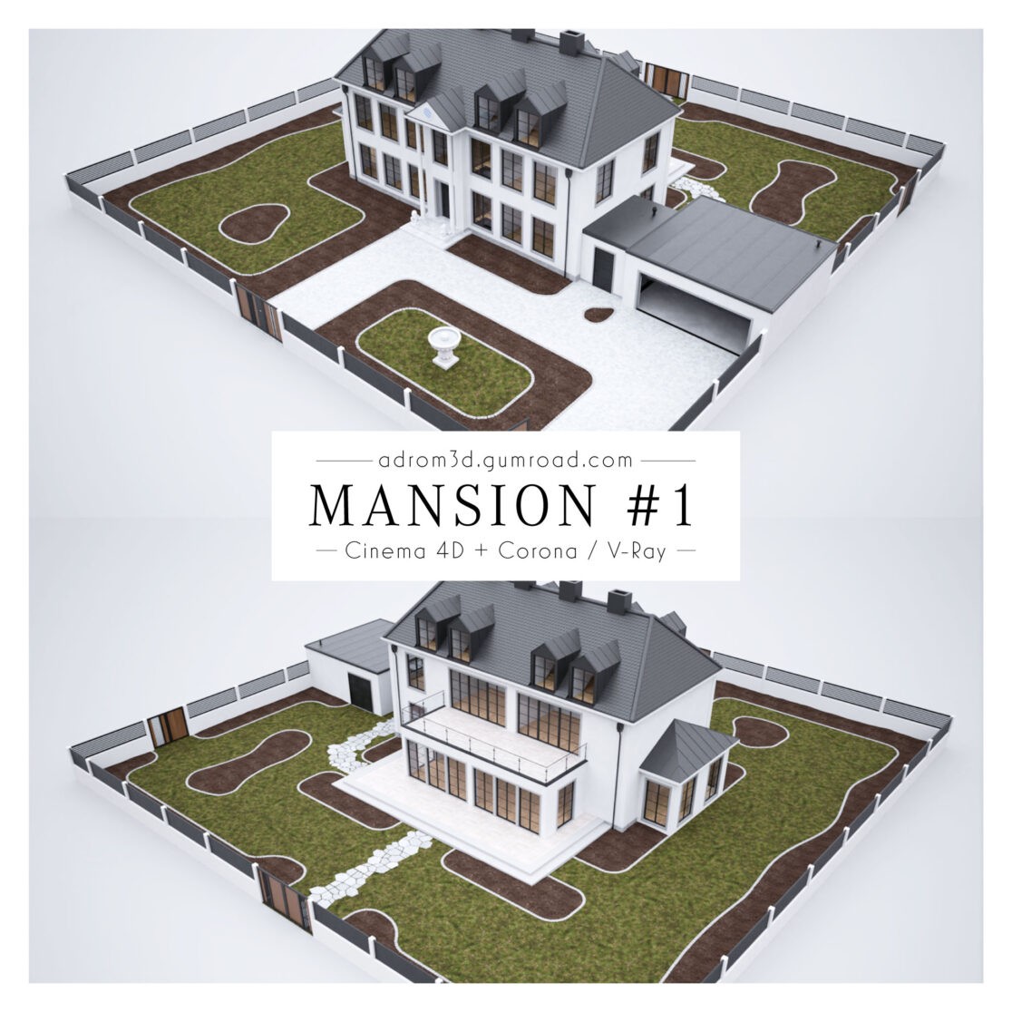 Ein luxuriöses Landhaus im europäischen Stil mit einer imposanten und detaillierter Fassade. Sowohl Front als auch Rück- und Schmalseiten sind vollständig ausgearbeitet. Insofern bietet sich das Modell für vielfältige Einsatzzwecke an. Neben klassischen Exterior-Shots lassen sich auch VR-Setups und 360 Grad-Panoramen umsetzen.